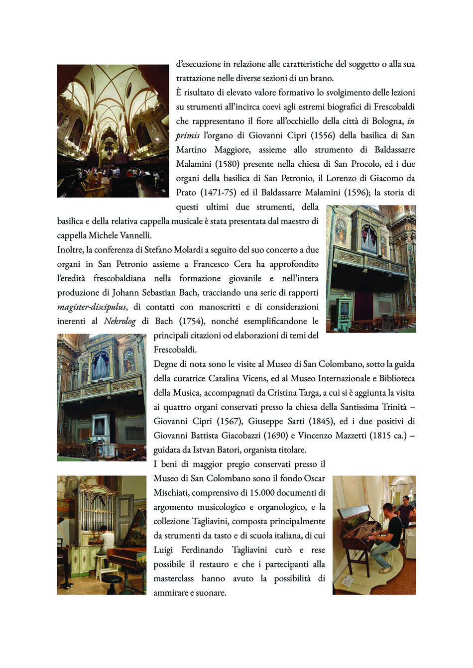 Prìncipi i due strumenti custoditi nella Basilica di San Petronio, costruiti da Lorenzo da Prato (1471- 75) e Baldassarre Malamini (1596), già protagonisti, nella prima serata del corso, di una rara esecuzione della Messa Polifonica di Merulo Susanne un jour (1573), da parte della Cappella Musicale diretta da Michele Vannelli e alternata a brani per organo eseguiti da Francesco Cera.