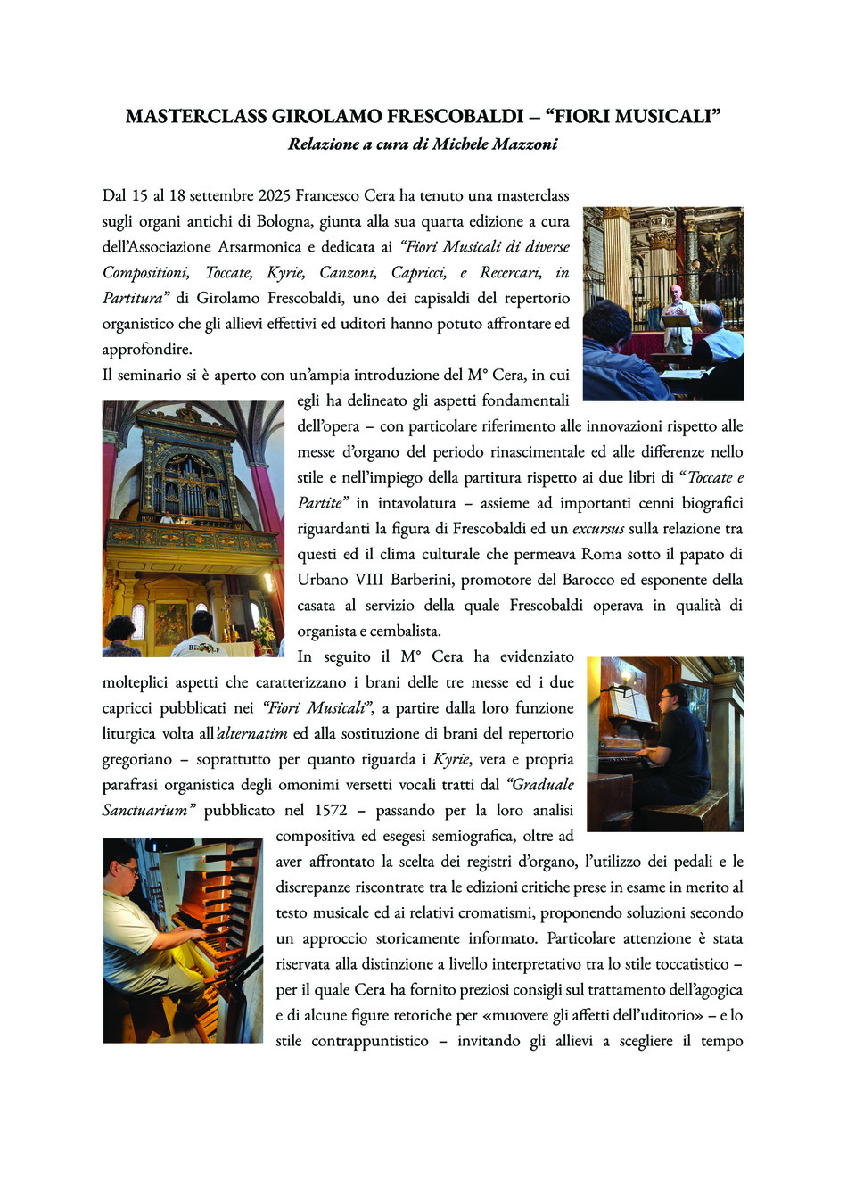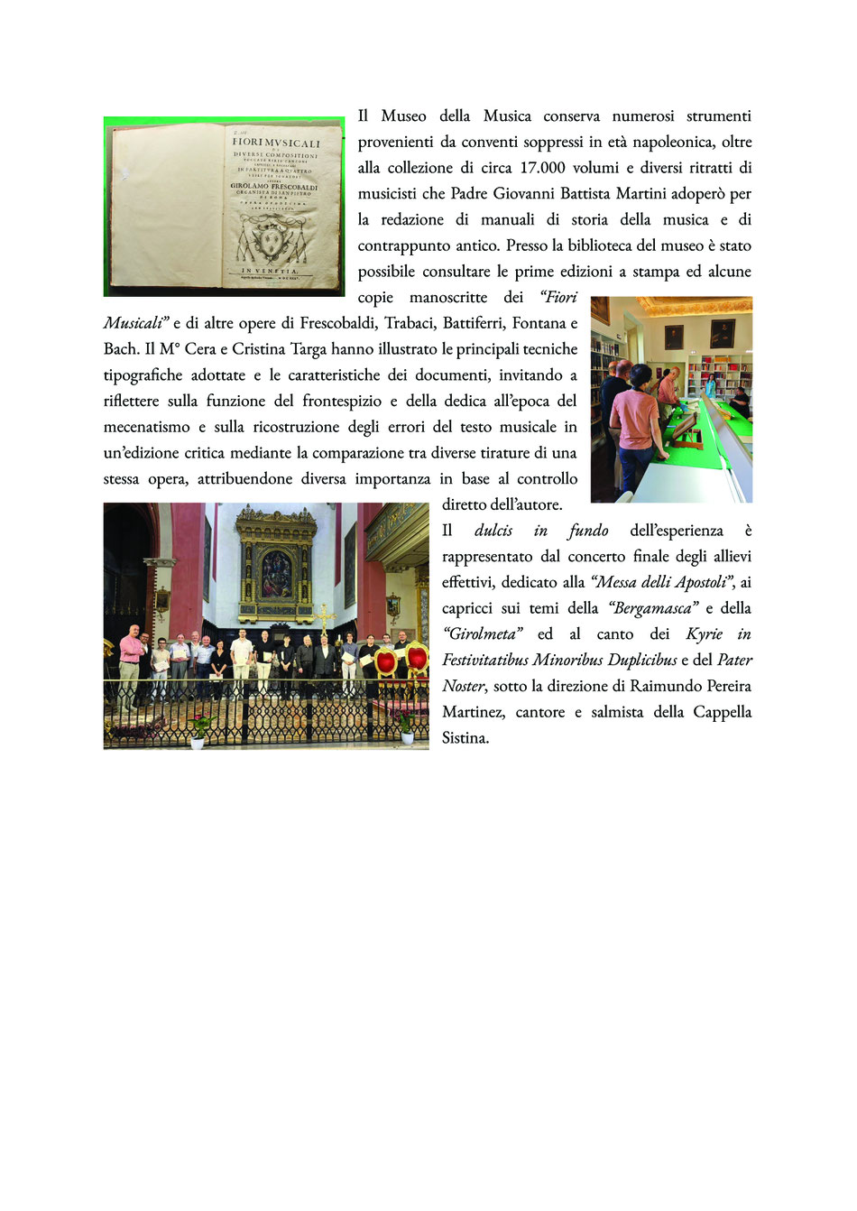 Il corso si è concluso con un concerto organizzato presso la Chiesa della SS. Trinità sugli organi Giacobazzi (1690), Cipri (1567), Mazzetti (1815), Sarti (1845), nel quale è stato proposto un variegato programma esecutivo dei generi tastieristici tipici del periodo storico (Toccate, Canzoni, Ricercari), dopo un intenso e sensibile lavoro di cesellamento del repertorio condotto dal maestro Cera.